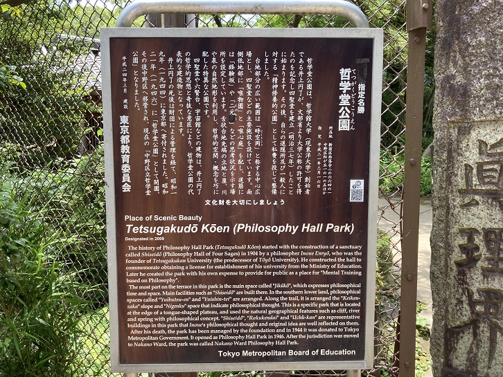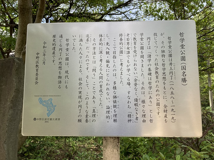 哲学堂は、東洋大学の創立者である故井上圓了先生が国家社会の恩に報いるために、護国愛理の理想に基づき国民道徳の普及を目的として、明治三十九年以来私財を投じ、自ら堂主となって独力経営された精神修養的公園であります。園地は、先生が唱えられた実践哲学の理想を表わす多くの施設と特異な造園手法とを加えて、都下の名所として人々に親しまれてきました。大正八年六月、先生は大陸巡遊の途中大連の宿舎でなくなられましたので、嗣子故井上玄一氏は、その志を継いで本園を経営することニ十余年に及びましたが、昭和十九年三月、公益優先の趣旨に則り、この園地一切を挙げて東京都に寄付されました。東京都では、故人の遺志を尊重し管理することになり、全国にもまれな文化修養公園として公開してきました。昭和五十年四月一日、中野区は東京都から移管を受け、歴史性の深い文化財公園、又区民の緑のオアシスとして公開しております。