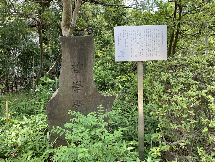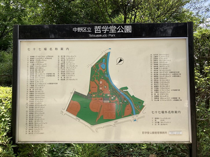もうひとつ、哲理門の案内板が立っています。「哲学堂七十七場4」というのは、哲学堂公園内に設けられた77場の哲学に由来するユニークな名前の建物や石造物・通路などの中の4番目の場という意味です。尚、77場名称案内板には76番と77番が見当たりませんが、無番号の「哲史塀」と「哲史蹊」が該当するみたいです。「哲史塀」は東西の哲学者を合わせた年表だったそうで、三祖苑の近くにあったのがいつの間にかなくなってしまい、資料が何も残っていないそうです。
