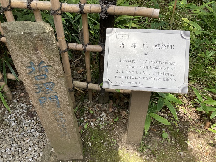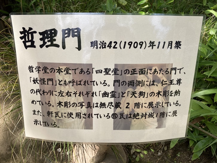 哲学堂の本堂である「四聖堂」の正面にあたる門で、「妖怪門」とも呼ばれている。門の両側には、仁王尊の代わりに左右それぞれ「幽霊」と「天狗」の木彫を納めている。木彫の写真は無尽蔵2階に展示している。また、軒瓦に使用されている(◯で囲んだ)”哲”瓦は絶対城1階に展示している。