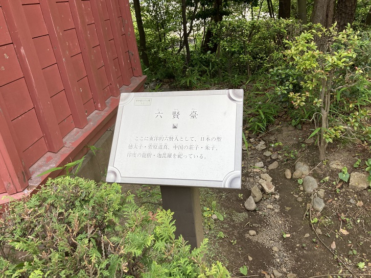 ここに東洋的六賢人として、日本の聖徳太子・菅原道真、中国の荘子・朱子、印度の龍樹・迦毘羅を祀っている。