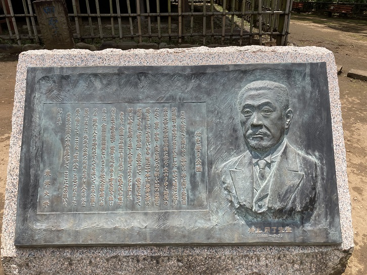 四聖堂の前、広場の中心に銅のプレートを貼った井上円了の案内板が置かれています。お寺に生れたということが井上円了の哲学思想に宗教的な影響を与えたのではないかと思います。