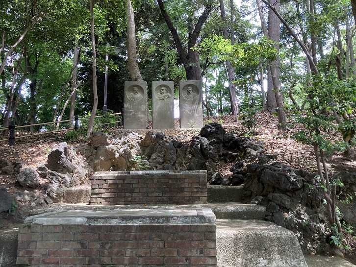 妙正寺川方向に下りる斜面の途中に階段状の小さなスペースがあり、三賢人の石碑が建っています。