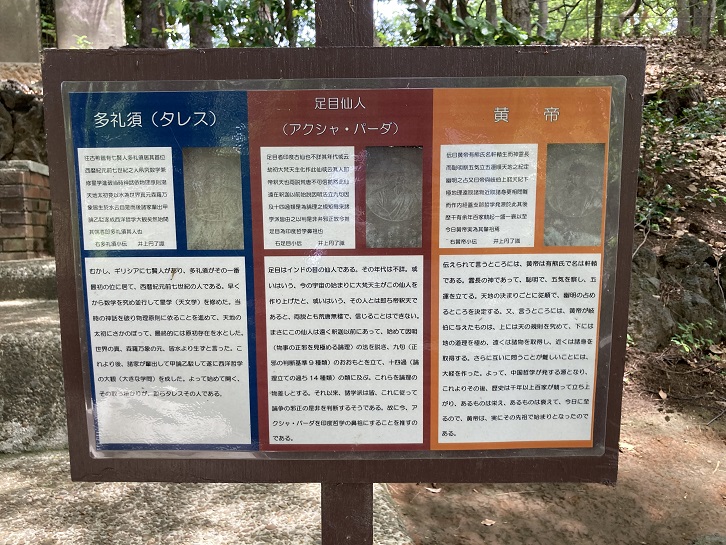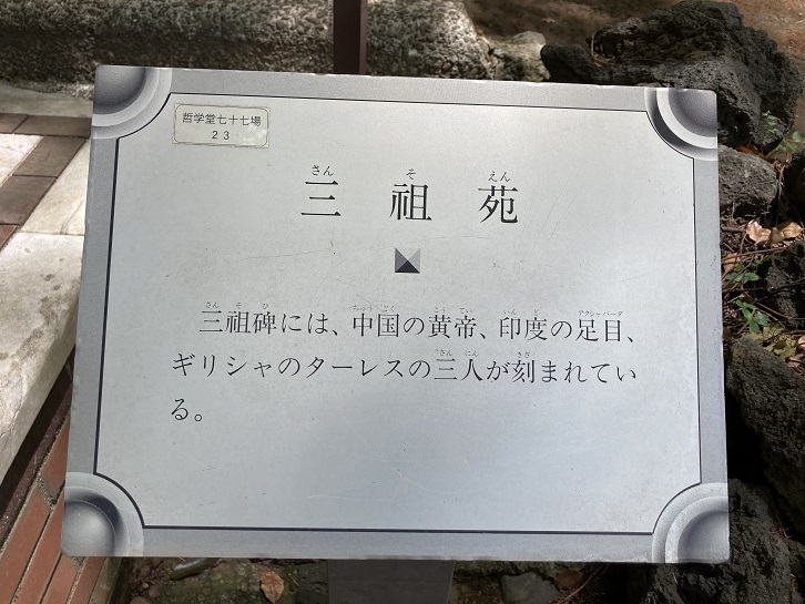三祖碑には、中国の黄帝、印度の足目、ギリシャのターレスの三人が刻まれている。