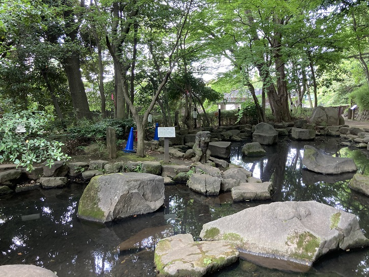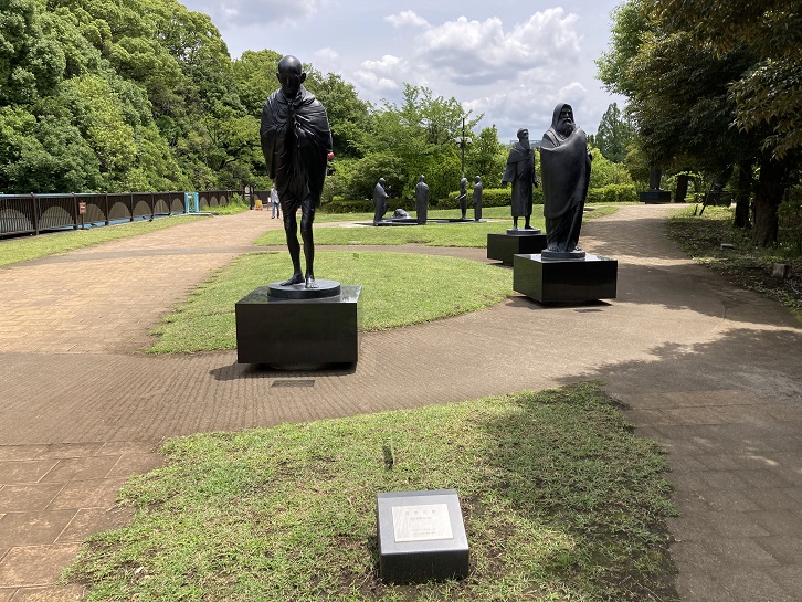 哲学堂の中は自然の山を思いおこさせます。起伏のある地形に池や階段が配置され、緑が豊かなので昼なお薄暗いというところもあります。小さな池(心字池と言うらしい)の岸辺に奇妙な石像が立っています。人の心中に宿る鬼を具現化したものだそうです。狸は腹の中に燈籠が入っていましたが、この鬼像は頭に燈籠を載せていたのだそうです。「。。。いた」というのは造られた当時のことで、今は頭の上にあった燈籠は欠けています。なんか窮屈な格好をしているなと思ったら、そういう事情があったんですね。