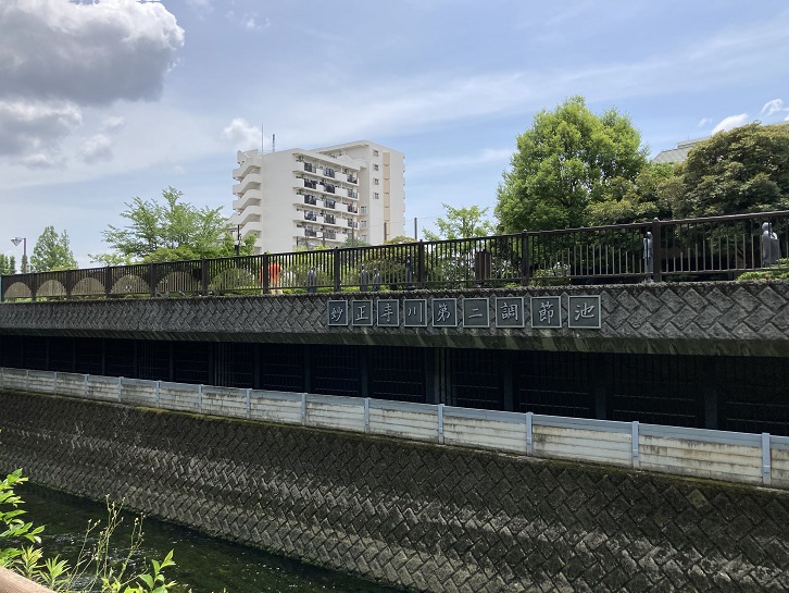 哲学堂公園は妙正寺川によって南北に分断されています。妙正寺川越しに妙正寺川第二調節池の取水口が見えます。都市を洪水から守る妙正寺川調節池群の一翼を担う施設です。妙正寺川が増水した際に、流入口となる越流堤から一旦中間調節池に導水され、ここが満水になって初めて第一調節池と第二調節池に流入するようになっています。これは第一調節池が平時は妙正寺川公園として開放されていることから、滞在者を避難させてから公園を閉鎖するまでの時間を稼ぐためと思われます。第二調節池は地下の調節池ですので直接中を見ることはできません。