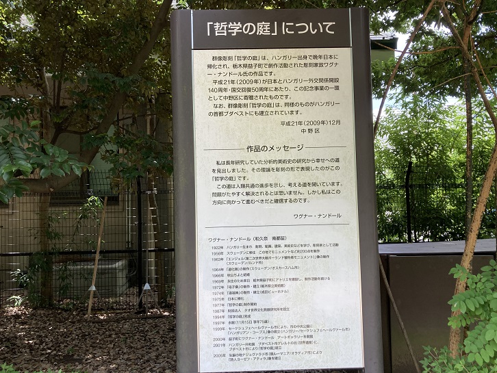 群像彫刻「哲学の庭」は、ハンガリー出身で晩年日本に帰化され、栃木県益子町で創作活動された彫刻家故ワグナー・ナンドール氏の作品です。平成二十一年(2009年)が日本とハンガリー外交関係開設140周年・国交回復50周年にあたり、この記念事業の一環として中野区に寄贈されたものです。なお、群像彫刻「哲学の庭」は、同様のものがハンガリー