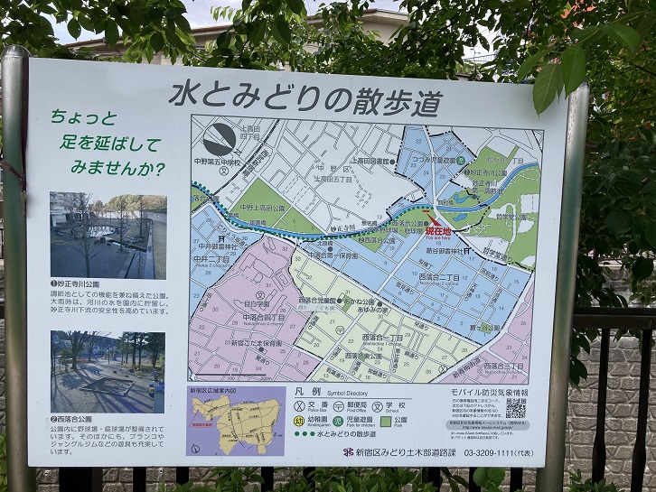 哲学堂公園を後にして、妙正寺川沿いの遊歩道を進みます。この遊歩道は「水とみどりの散歩道」となっているそうです。遊歩道の脇に案内板が立っています。