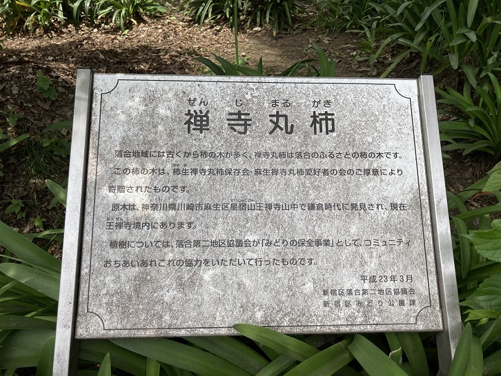 落合地域には古くから柿の木が多く、禅寺丸柿は落合のふるさとの柿の木です。この柿の木は、柿生禅寺丸柿保存会・麻生禅寺丸柿愛好者の会のご厚意により寄贈されたものです。原木は、神奈川県川崎市麻生区星宿山王禅寺山中で鎌倉時代に発見され、現在王禅寺境内にあります。植樹については、落合第二地区協議会が「みどりの保全事業」として、コミュニティおちあいあれこれの協力をいただいて行ったものです。