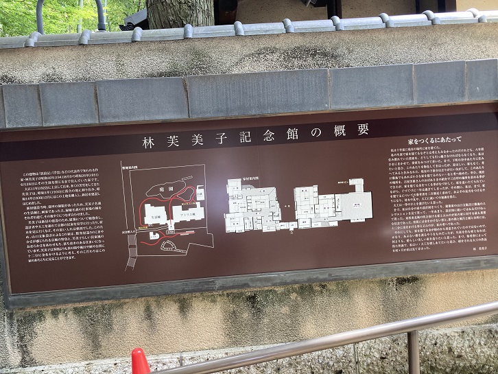 入口の門をくぐった先に、記念館の概要と新居建設に際しての林芙美子の思いを綴った案内板が掲げられています。