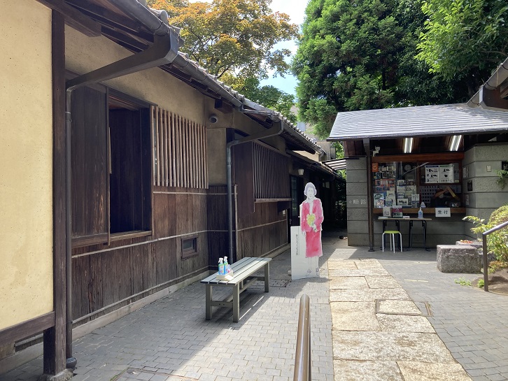 母屋の隣に受付があり、その前で林芙美子のボードが出迎えてくれます。随分と洋風な服装ですね。