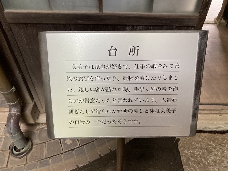 芙美子は家事が好きで、仕事の暇をみて家族の食事を作ったり、漬物を潰けたりしました。親しい客が訪れた時、手早く酒の肴を作るのが得意だったと言われています。人造石研ぎだしで造られた台所の流しと床は芙美子の自慢の一つだったそうです。