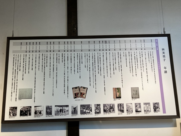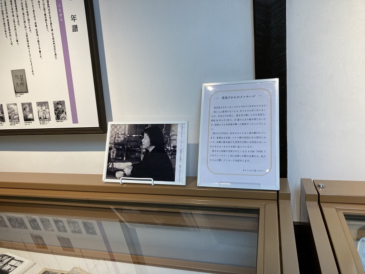 展示室には、林芙美子の生涯を記した年表が貼られています。その脇に亡くなる数日前に録音されたインタビューについての解説があります。林芙美子は作家盛りの47歳という若さで亡くなりました。「主婦の友」の連載記事のために料亭を2軒回った帰宅後の昭和二十六年(1951年)6月27日の夜分に苦しみ出し、翌28日早朝心臓麻痺で急逝したのです。急逝の直前、6月24日にNHKラジオの生放送「若い女性−会ってみたい人の頁」にゲスト出演し、女子大生数人に対し質疑応答を行いました。この中で芙美子本人が「すでに晩年であると思い、むだな球は投げない」とも語っていました。この放送時の一部が当時の番組広報用として映像保存されており、NHKアーカイブスのサイト「NHK放送史−若い女性」で動画が公開されています。放送音声は録音保存され、2016年1月26日にNHK第1ラジオで放送されました。瀬戸内寂聴みたいな存在だったのでしょう。生前、色紙などに好んで、「花の命は短くて 苦しきことのみ 多かりき」と書きましたが、これは「女性を花にたとえ、楽しい若い時代は短く、苦しいときが多かったみずからの半生をうたったもの」といわれています。