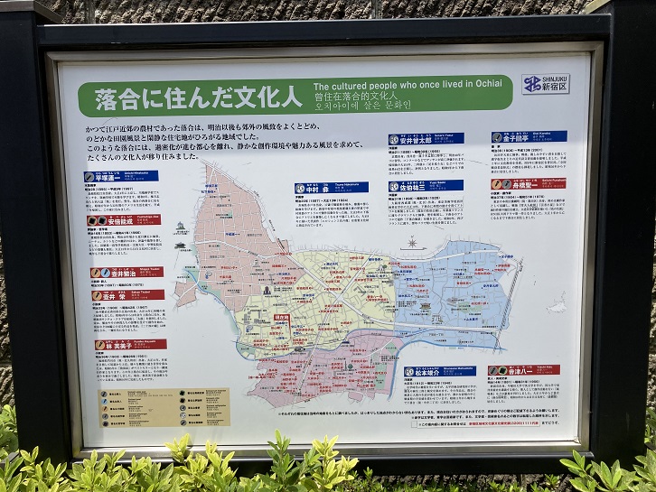 林芙美子記念館を出て、西武新宿線の中井駅に向かいます。記念館近くの道路の脇に、落合に住んだ文化人を紹介した案内板が立っています。落合には多くの文化人が過密化が進む都心を離れ、静かな創作環境や魅力ある風景を求めて移り住みました。木版画家の平塚運一、評論家・哲学者の阿倍能成、小説家の壺井栄や林芙美子、洋画家の安井曾太郎や松本竣介、書家の金子(鴎)亭、劇作家の船橋聖一、歌人・美術史家の會津八一などなど、馬込や田端と同様に、落合も文士村だったんですね。