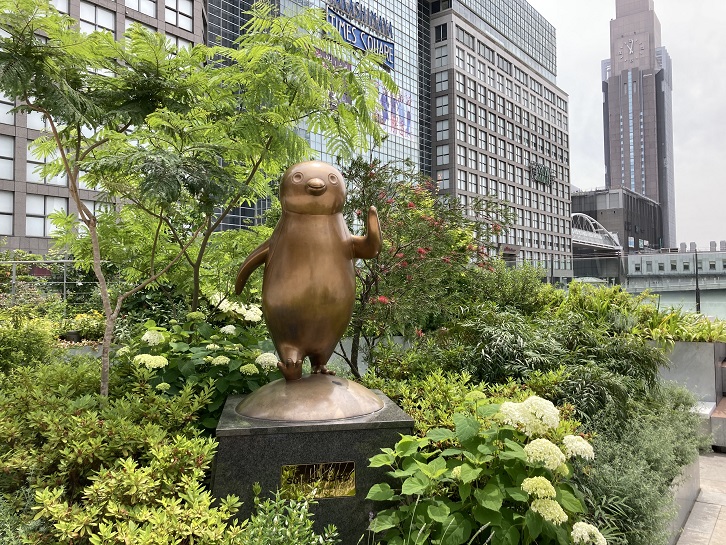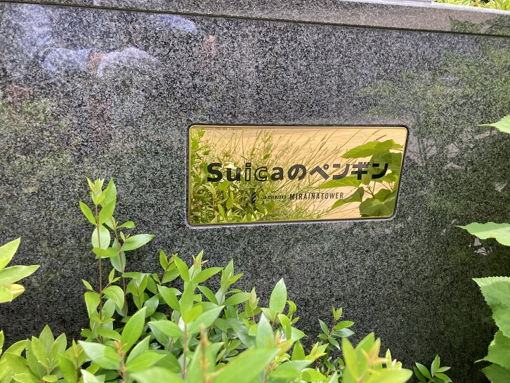 広場の中に、「SUICAのペンギン」をオブジェ化したブロンズ像が置かれています。高さ約2.5m(台座含む)の像は、未来へ向かって歩んでいく姿を表現しています。台座の裏面(線路側)には、SUICAの歴史を記載したカードパネルが設置されているそうですが、植え込みに遮られて見落としました。