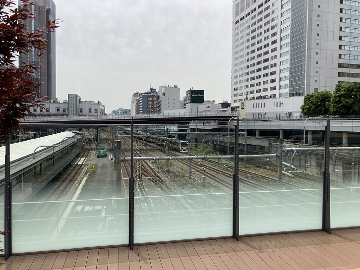 広場からは複雑に絡み合った線路を走る電車、左手には新宿高島屋が入る「TIMES SQUARE」やエンパイアステートビルを想わせるNTTドコモ代々木ビル、右手にはJR東日本の本社ビルが眺められ、オープンデッキと相まって新宿の隠れた観光スポットになっています。