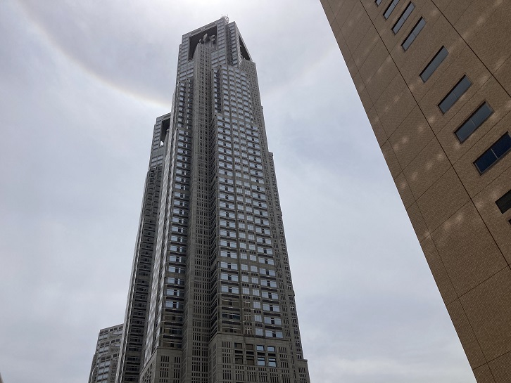 都庁舎はツインタワーになっています。第一本庁舎は地上48階・地下3階・高さ243mで、竣工時には池袋のサンシャイン60を抜き、日本一の高さを誇っていました。バブル景気の最中に計画された超高層ビルであり、「バベルの塔」をもじって「バブルの塔」、また投入された税金から「タックス・タワー」と揶揄されることもありましたが、東京の観光名所のひとつとして人気を集め、第一本庁舎の45階に設置されている展望室には訪れる人が絶えません。地上202メートルの高さから東京の街を一望できます。夜間はライトアップされ、コロナ渦の緊急事態宣言時には「血の塔」と化しました。第二本庁舎は地上34階・地下3階・高さ163mで、業務棟となっています。第一本庁舎の32階と第二本庁舎の4階には職員食堂があり、来庁者は誰でもセルフ方式で利用できるそうです。食材ロス削減のため、バイキング形式にしてもらえたらいいのですが。