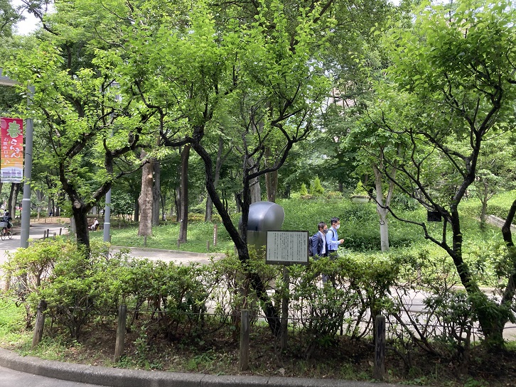 公園内の植え込みの中に、「写真工業発祥の地」という案内柱が立っています。その横には文化財認定のプレートが置かれています。
