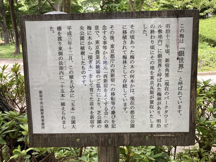 明治十三年頃、新宿角筈(現在のパークタワービル敷地内)に銀世界と呼ばれた梅林があり、明治の終わり頃にその地を東京瓦斯が買収いたしました。その頃あった梅の木の何本かは、現在の都立公園に移植されて梅林として存続しています。その後、東京都庁の西新宿への移転等の慶びを記念する事等から地元「西新宿をよくする会」の発意で、東京農業試験場のご協力により、芝公園の梅に(の?)木から「接ぎ木」をして育てた苗木を新宿中央公園に植樹したものです。平成三年十二月、この植え込みに「五本」、公園大橋を渡り東側の法面(のりめん)内に「十五本」植えられました。