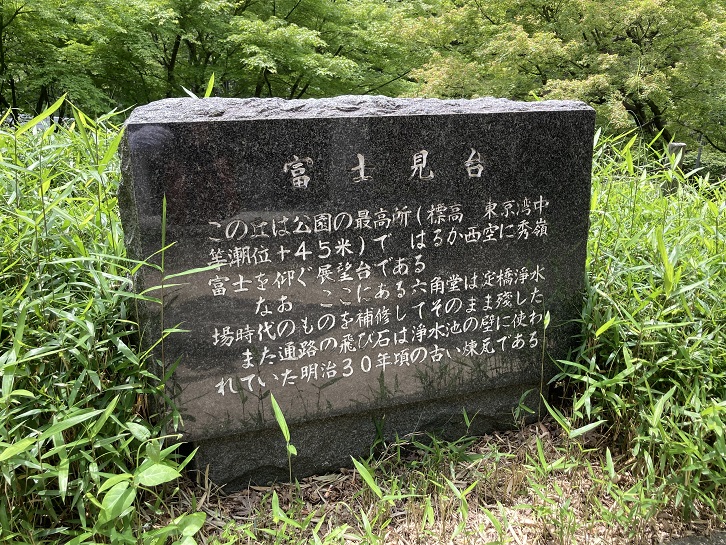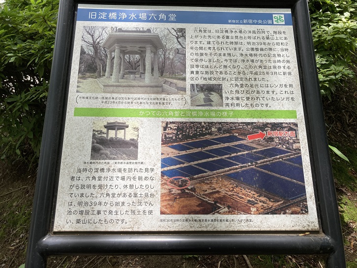案内板も立っています。六角堂はかっての浄水池群の西端の高台に建てられています。ここから浄水池の全景を眺めるために設置されたのでしょう。東に浄水池、西に富士山の眺望が楽しめる六角堂には物見遊山の人々が押し寄せたことでしょう。