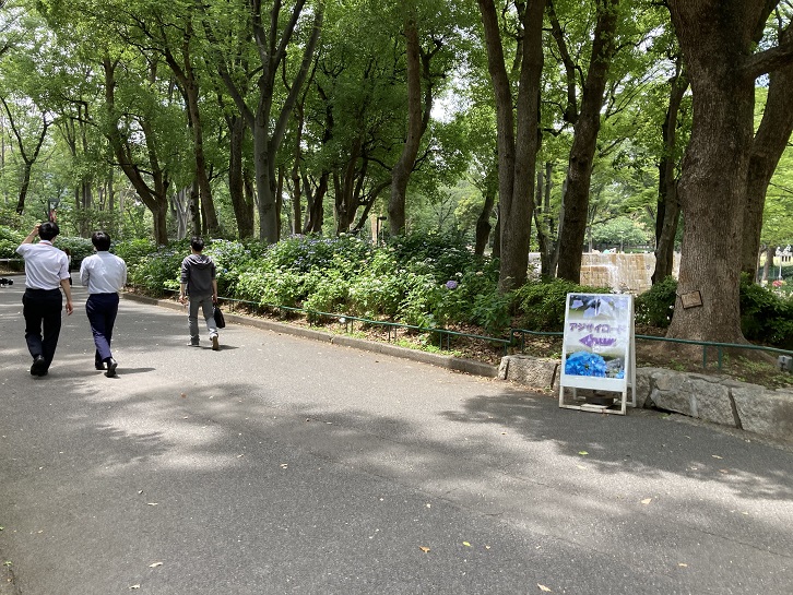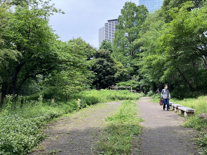 都庁舎の隣には広大な新宿中央公園が位置しています。新宿中央公園は前のコースでも訪れましたが、今回は南側の入口から入ります。入口を進んだ左手には夏の間開設されるジャブジャブ池があり、多くの親子連れが訪れます。今は梅雨前ですので、池は干上がって誰もいません。