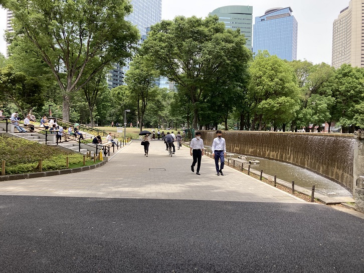 新宿中央公園の緑の多さには圧倒されます。周辺には企業が入居するオフィスビルが多く、昼休み時には大勢のサラリーマン達が散策したり、石段に腰を下ろして休んだりと、癒やしの場になっています。