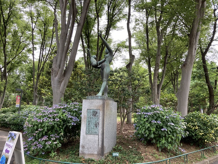 植栽の中に、「やわらぎ」というテーマのブロンズ像が置かれています。これもパブリックアート作品のひとつなのでしょう。子供が母親の手から落っこちそうですが。