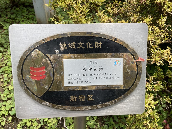 この地は、明治三十五年五月、小西本店(現・コニカミノルタ)が、写真感光材料の国産化を図り、研究所と工場(六桜社)を建設し、製造を始めたところである。同社は、さらにカメラの製造も始め、写真フィルムの国産化にも成功した。その後、昭和三十八年、新宿副都心建設事業により、八王子・日野へ移転した。今日わが国は、世界の写真王国となっているが、その礎は、この地で築かれたものである。