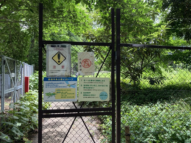 公園の外れに、緑濃い雑木が生い茂る一画があります。ビオトープは、生物群集の生息空間を示す言葉で、ギリシア語の「bio(命)」と「topos(場所)を合成した造語です。元々は、ドイツで生まれた生物の生息場所を意味する概念です。生物が住みやすいように環境を改変することを指すこともあります。日本では1990年代から環境共生の理念のもとで、環境改善の意味合いでビオトープの名を冠した事業が行われるようになってきました。ある生物を保護するとしても、その生物単体の採取を規制するだけでは駄目で、その餌となる生物や繁殖地、さらに餌となる生物が食する植物など関連する自然生態系全体を維持する必要性が次第に認識されてきています。新宿中央公園ビオトープでは、都市ではなかなか見ることができなくなったバッタやチョウなどのさまざまな生き物や草花たちに出会うことができます。