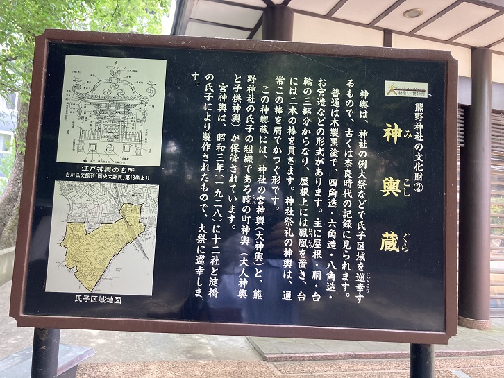 神輿は、神社の例大祭などで氏子区域を巡幸するもので、古くは奈良時代の記録に見られます。普通は木製黒塗で、四角造・六角造・八角造・お宮造などの形式があります。主に屋根・胴・台輪の三部分からなり、屋根上には鳳凰を置き、台には二本の棒を貫きます。神社祭礼の神輿は、通常この棒を肩でかつぐ形です。この神輿蔵には、神社の宮神輿(大神輿)と、熊野神社の氏子の組織である睦の町神輿(大人神輿と子供神輿)が保管されています。宮神輿は、昭和三年(1928年)に十二社と淀橋の氏子により製作されたもので、大祭に巡幸します。