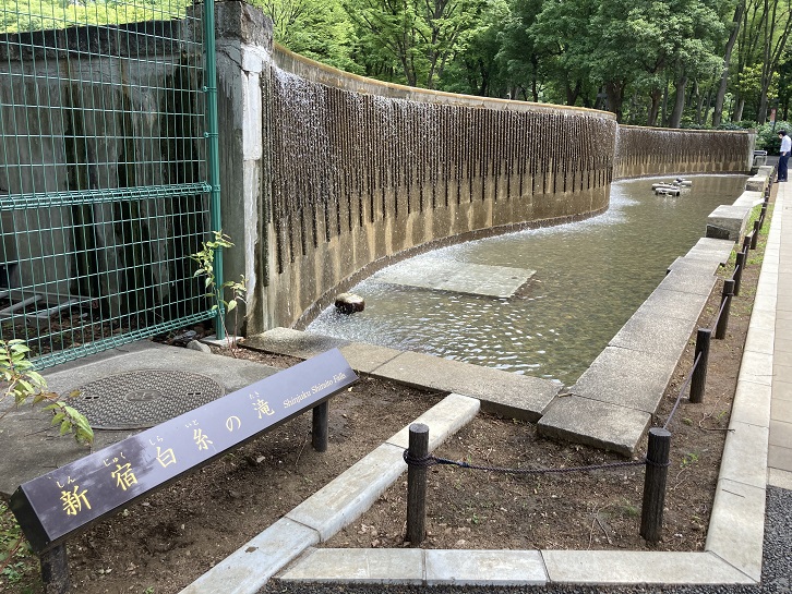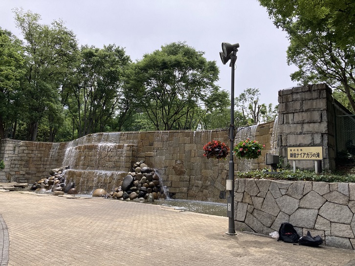 新宿中央公園には、ふたつの人工の滝が造られています。入口広場に面した新宿ナイアガラの滝は、カナダのオンタリオ州とアメリカのニューヨーク州の国境沿いに位置し、北アメリカ大陸の中で最も規模の大きいナイアガラの滝をイメージしています。中央に岩による段差が設けられ、滝しぶきが一段と迫力を増しています。昭和五十七年に完成し、夏には涼を呼ぶ人気のスポットになっています。