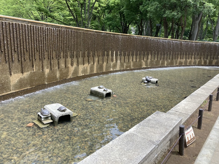 もうひとつの滝は、ナイアガラの滝の裏面に造られていて、新宿白糸の滝という名前が付けられています。流下する水の様子が白糸や絹糸を垂らしたようであることから、日本各地の山間にある白糸の滝をイメージしたものです。ちなみに、日本三大名瀑布には、和歌山県那智勝浦町の那智川中流にかかる「那智滝」と栃木県日光市の華厳渓谷にある「華厳滝」と地元の瀑布を含めるのが通例ですが、静岡県富士宮市にある「白糸の滝」を挙げる人が少なくありません。亀が甲羅干しをしている「新宿白糸の滝」を挙げる人はまずいないと思います。