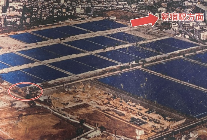 左側が旧淀橋浄水場当時の六角堂、右側が昭和三十六年の淀橋浄水場(赤い丸が六角堂)です。これらの浄水池跡に超高層ビルが林立するとは誰も想像すらできなかったでしょうね。