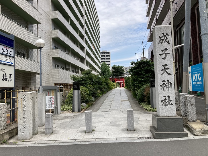 成子天神社は菅原道真公を祭神とし、延喜三年(903年)に創建されました。当時、菅原道真の死去を嘆き悲しんだ家臣が道真の像を配流先の大宰府から持ち帰って祀ったのが始まりといわれています。その後、鎌倉時代に源頼朝により社殿が造営され、江戸時代に入ると将軍徳川家光から土地を下賜された春日局が勧請しました。寛文年間に起きた火災により、それまでの記録や社宝などが焼失してしまい、現在地に移転しました。第二次大戦中にも空襲により社殿が焼失しましたが、1966年に鉄筋コンクリート製の社殿を建て、再建されました。しかし、老朽化のため2013年、境内に高層の分譲マンション・賃貸マンションと神社施設を新たに建築し、現在に至っています。境内には小山に富士山の溶岩を加えて大正九年(1920年)に築かれた高さ12mの富士塚があり、新宿区内では最大規模となっています。私も別のコースを歩いた時にへっぴり腰で登頂を果たしました。