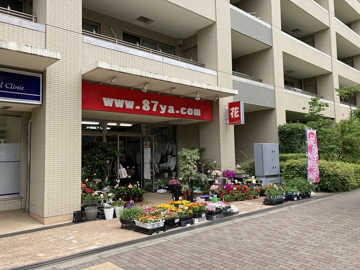 税務署通りと青梅街道が分岐する成子坂下交差点脇に花屋さんがあります。梅雨入り前のこの季節、店頭の花も生き生きとした新緑に輝いています。お店のドメイン名が「87ya(ハナヤ)」というのも洒落てますね。
