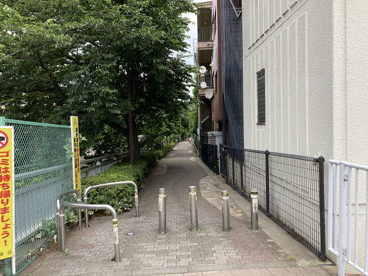淀橋の手前で右折し、神田川遊歩道に入ります。遊歩道には桜の並木が続いています。お花見シーズンには川面まで垂れ下がる枝に満開の桜の花がこぼれ、神田川の桜のスポットのひとつになっています。