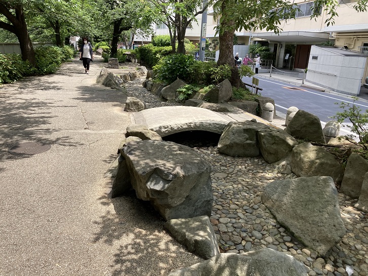 小滝橋の手前に神田上水公園があります。神田川沿いの細長い敷地ですが、植栽とか健康遊具とかが充実しています。新宿区のHPには、「延長約600mのなかに流れや遊具で遊べる空間があります。園内の桜並木はみどりの新宿30選に選ばれており、四季折々に美しいです。」と紹介されています。今日は流れは干上がっているようです。