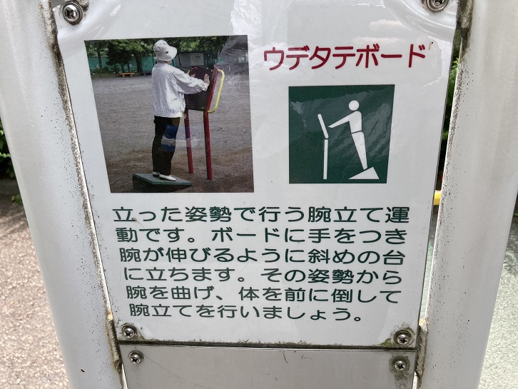 次は「ウデタテボード」です。腕立て伏せはストレッチ運動の中でも腕力の要るものですが、少し斜めに立った状態で板に向かって行うとそれほど腕力も必要なく、お年寄りでも気軽に出来ます。私でも100回位は出来そう。