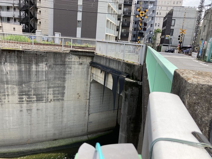 瀧澤橋の先で神田川本流は東に大きく方向を変えます。この先、暫くは側道が途切れます。回り道をしようとしたのですが、どう間違えたのか西武新宿線の線路に突き当たってしまいました。仕方がないので、踏切を渡って一旦新目白通りに出ます。妙正寺川に架かる辰巳橋の下に高田馬場分水路の出口があります。この地点で妙正寺川は高田馬場分水路に合流し、終端となります。