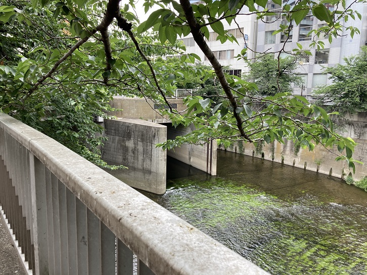 「東京の河川を歩く」で桃園川を歩いた際に、神田川との合流点そばに架かる末広橋に開口部がないことに不思議な思いをしました。後で調べてみて、末広橋の下流側に開口部があることが分かりました。確かに、末広橋の下流側に大きな口を開けていますね。今では桃園川暗渠を流れる水は周辺地域の汚水などが集まったもので、通常時は合流地点からは流れ出ず、別の地下管渠で落合水再生センターへ直接送られて下水処理されているそうです。神田川との合流点では、通常流れ出る水はほとんどありません。降雨時などの臨時の出口になっています。とすると、ここに水が流れ出す時は汚水も一緒に?