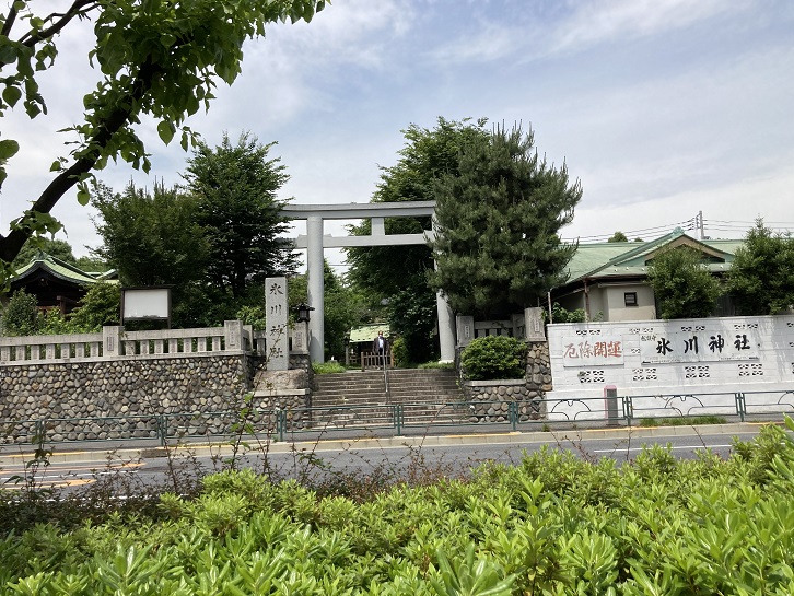 辰巳橋の先の新目白通りに面して氷川神社の大鳥居が聳えています。
