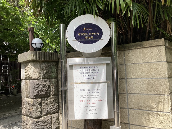 三島橋の先に一見民家風の「東京染ものがたり博物館」があります。入口の門柱の前には、「新宿区の地場産業染色。江戸の伝統を今に伝える東京染小紋や、江戸更紗の制作工程や作品をご覧戴けます。」と書いてあります。富田染工芸は、老舗の染工房で、江戸っ子が好んだ粋を現代に伝えています。