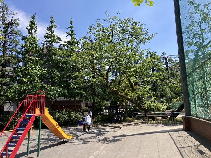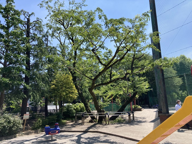 北新宿公園まで足を延ばしたのですが、結局どの木がイヌザクラなのか分かりませんでした。家に帰って案内板の写真をよ〜〜〜く見ますと、(下の写真には写っていませんが)滑り台の横の囲いの中に立っている木がそれらしいことが分かりました。