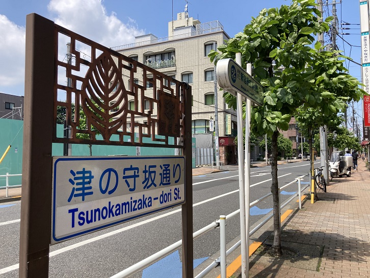 津の守坂通りは、四谷二丁目付近の新宿通りから、曙橋付近の靖国通りまでを南北に結ぶ道路です。新宿通り四谷方向と靖国通り新宿方向・外苑東通り牛込方向を短絡する道としてよく利用されています。「津の守坂」は三栄町交差点から合羽坂下交差点にかけて緩やかに下る坂ですが、江戸時代に隣地(荒木町周辺)に尾張徳川家の分家である美濃高須藩主・松平義行(摂津守)の上屋敷があったことからこの名前が付けられました。
