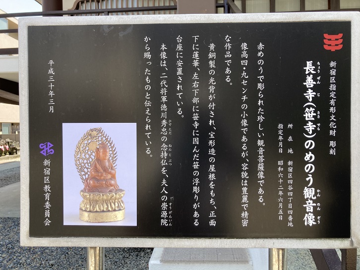 笹寺(正式名称は長善寺)は天正三年(1575年)甲斐国武田氏の臣高坂弾正昌信の住居に結ばれた草庵を起源とし、四谷付近では最古の寺院のひとつです。二代将軍徳川秀忠が長善寺に立ち寄った際に、笹が繁ったいたことから笹寺と称するよう命じられ、この名が付いたといわれています。一説には長善寺の笹が江戸城紅葉山に移植されたとも伝えられています。笹寺には、めのう観音像が祀られているとのことです。崇源院は浅井長政の三女で、母は織田信長の妹であるお市の方です。浅井三姉妹の一人で、長姉の淀殿(茶々)は豊臣秀吉の側室、次姉の常高院(初)は京極高次の正室です。