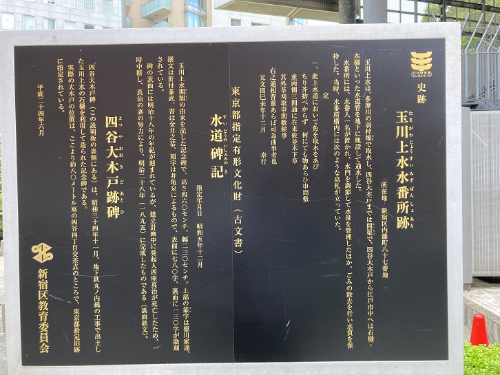 四谷大木戸碑(この説明板の裏側にある)は、昭和三十四年十一月、地下鉄丸ノ内線の工事で出土した玉川上水の石樋を利用して造られた記念碑である。実際の大木戸の位置は、ここより約80メートル東の四谷四丁目交差点のところで、東京都指定旧跡に指定されている。