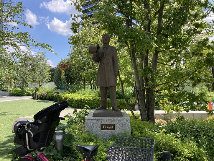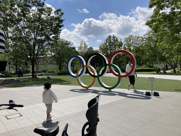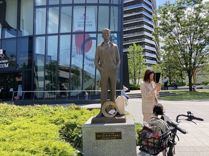 建物前の広場には、日本のオリンピック初参加に尽力した嘉納治五郎や、古代オリンピックを復興させ近代オリンピックの基礎を築いたクーベルタン男爵の銅像も建っています。「このおじさん、だ〜〜〜れ?」と訊かれてお母さんがスマホで調べているようです。