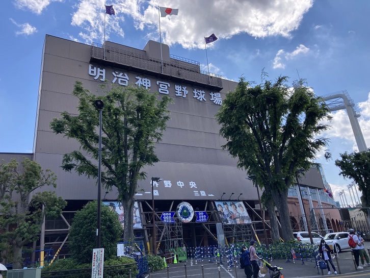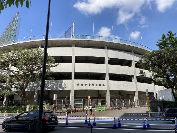 建物と道を隔てて神宮球場と神宮第二球場が隣り合っています。神宮球場は、大正十五年(1926年)に開場してから大学野球の主要球場として長年使用され、東京六大学野球の他、東都大学野球1部リーグとその入替戦を中心に今日まで使用されています。日本国内では阪神甲子園球場と共に「野球の聖地」といわれるスタジアムです。ネットの情報では、神宮外苑地区の再開発計画により、将来的に解体されて現在の秩父宮ラグビー場の跡地に新球場が建設されるとのことです。一方、明治神宮第二球場は昭和三十六年(1961年)に完成したやや小ぶりなスタジアムです。元々は明治神宮相撲場として開設されましたが、その後野球場に改築されました。球場の用地が狭い上に、外野後方には道路が通っているために外野スタンドがなく、フェンスに沿って高い防球ネットが張られています。また、神宮第二球場は明治神宮外苑ゴルフ練習場(外苑ゴルフクラブ)の西練習場を兼ねていて、一塁側ダッグアウト付近から右翼ポール際にかけてゴルフ練習用の打席が121打席設置されています。しかし、2019年11月3日の秋季東京都高等学校野球大会準々決勝日大三対帝京戦を最後に野球場としての使用は終了し、球場を解体した後に新秩父宮ラグビー場が建設されるとのことです。歩いた時は気が付きませんでしたが、写真をよくよく見ると球場の入口は工事用のフェンスで囲われていますね。