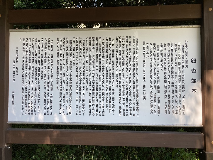 四並列の銀杏の大木が作り出した、世界に誇り得る銀杏並木の景観。これを通し、正面に白亜の絵画館を望む人工自然美の素晴らしさ。若葉・青葉・黄葉・裸木と四季折々の美しさ。長年にわたる管理、手入れの良さが見事な樹形を作り出しております。この、明治神宮外苑は大正十五年(1926年)十月二十二日の創建でありますが、その苑地造成に当たり、青山通り正面からの直線主要道路は、左右歩道の両側に植樹帯を取り、銀杏樹をもって四条の並木を造成することになりました。これは、銀杏樹が、樹姿端正・樹高よろしく・緑量も豊富・気品高く・公害にも強く、威厳を保ちつつ年間を通しての来苑者に好景観を呈示し、外苑の広幅員街路の並木として最適なものとの考えによるものです。この外苑の銀杏樹が、この世に実生えたのは、造園界の泰斗・折下吉延博士(外苑造成時の庭園主任技師・昭和四十一年八十六歳で没)が、新宿御苑に奉職中の明治四十一年(1908年)新宿御苑在来木の、銀杏樹から銀杏を採集し、これを種子として代々木の宮内省南豊島御料地内(現在の明治神宮内苑)の苗圃に蒔いたことによります。その後、苗圃の木々はすくすくと成長し、その数1600本にもなりました。外苑造苑に当たり、この銀杏樹を採用することとなり、既に樹高六メートル内外に成長していた、これら多数の中より候補樹を選抜し、更に並木として適格になるよう、年々樹形を整えてきたものを、大正十二年(1923年)に植栽したものです。直路四条の並木と、途中西折して女子学習院正門(現秩父宮ラグビー場)に至る二条の並木も同時に植えられております。最高二十四メートル・目通り周り二メートル八十センチ、最低十七メートル・目通り周りーメートル八十センチのものを、樹高順に青山口より降り勾配に従つて植えられております。絵画館を眺む見事な遠近法の活用です。