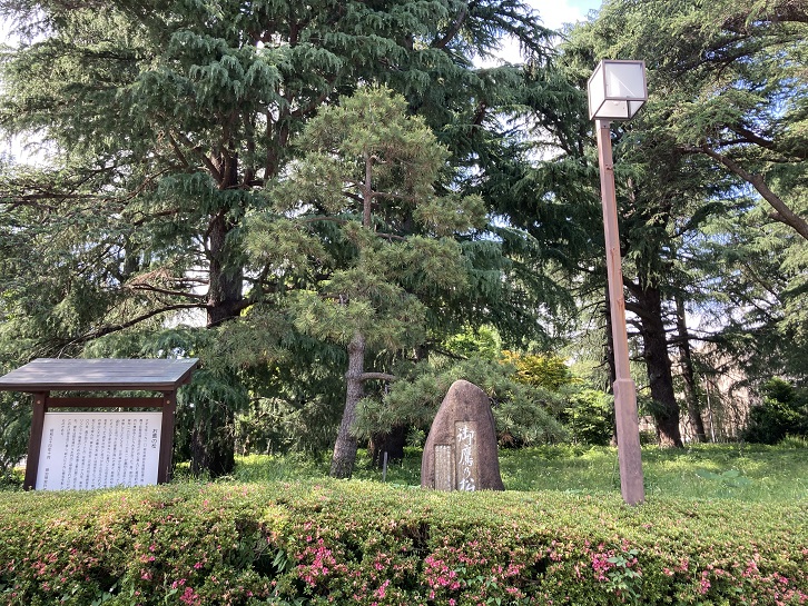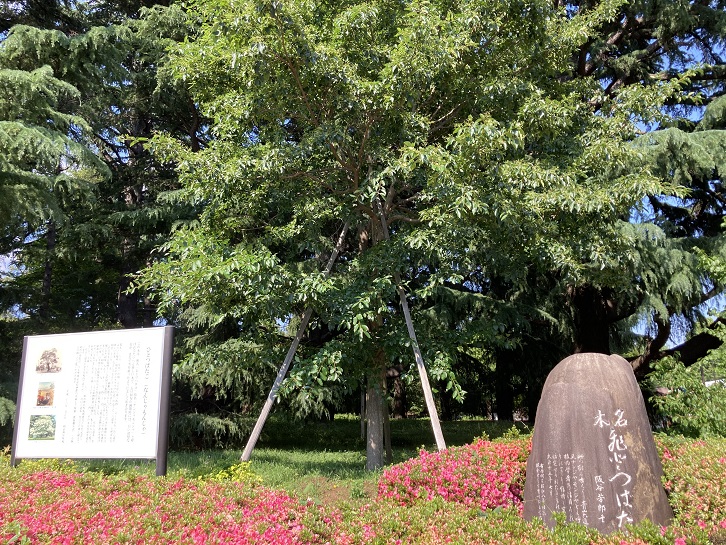 Uターンして絵画館方向に戻ります。その途中に明治天皇縁の榎が聳える一画があります。