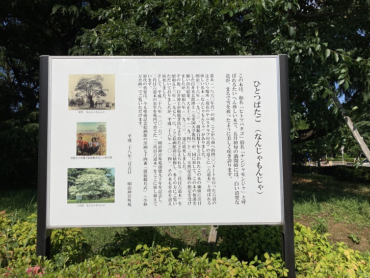 この木は、和名「ヒトツバタゴ」俗名「ナンジャモンジャ」と呼ばれるたいへん珍しい木で、五月初旬の満開時には、白い清楚な花が、まるで雪を被ったように美しく咲き誇ります。幕末(1860年代)の頃、ここから南へ約400メートル行った六道の辻という場所(現在のテニスクラブ付近)の近くに「六道木」と呼ばれる珍しい名木(なんじゃもんじゃ)がありました。明治三十六年(1903年)、樹齢百数十年と言われたこの木の価値に注目した白井光太郎博士(元帝国大学教授)が、国に対して、この木の保護を願い出た結果、大正十三年(1924年)十二月、天然記念物の指定を受けましたが、昭和八年(1933年)、遂に枯死しました。その後、白井博士が根接ぎ法により得たと伝えられる「二代目六道木」を昭和五十三年(1978年)に、ここ絵画館前に植樹し、多くの方にご覧いただいておりましたが、平成二十六年(2014年)、その木も寿命を迎え枯死しました。そして、平成二十八年(2016年)、明治神宮外苑創建九十年を記念し、二代目六道木の実生を苑内で育てた「三代目六道木」をここに移し植えています。初代の勇姿は、今も聖徳記念絵画館の洋画七十四番「凱旋観兵式」(小林万吾画)でご覧いただけます。